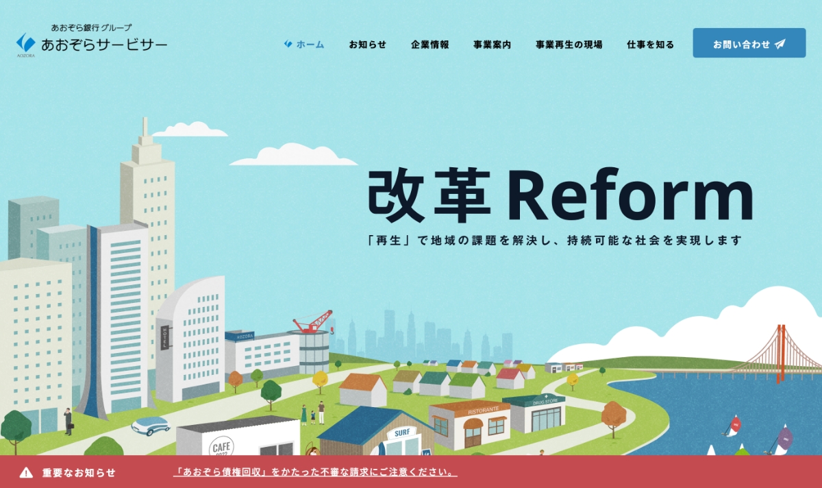 あおぞら銀行の子会社「あおぞら債権回収株式会社」様のWebサイトリニューアル、全体のイラスト作成とデザインを担当いたしました。